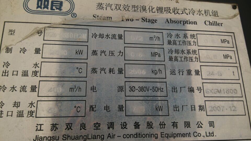 處理200萬大卡江蘇雙良溴化鋰制冷機;詳細(xì)參數(shù)SXZ6-233DHM2,生產(chǎn)日期2007年12月,制冷量2330KW,200萬大卡,機組在位運行,運行狀況良好,外觀成色8成新,可質(zhì)保1年,有需要者請與王志高聯(lián)系;手機13861712925,13812296168(手機號碼可添加微信)有圖有真相: